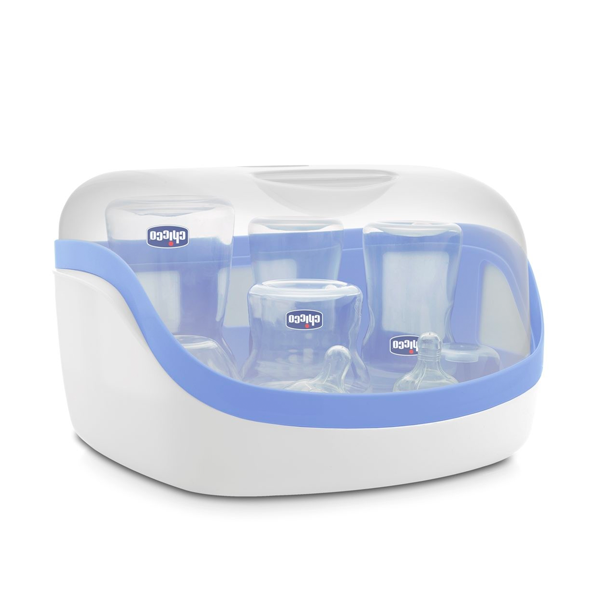 El esterilizador de biberones para horno microondas de Chicco compatible con la mayoría de todos los hornos de microondas y diversos tamaños de biberones y accesorios. En tan solo 3 a 8 minutos podrás eliminar el 99% de las bacterias para los accesorios y biberones de tu bebé.