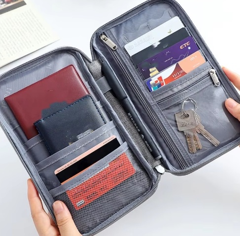 Ideal para guardar tarjetas, billetes y pasaportes de manera segura y accesible.