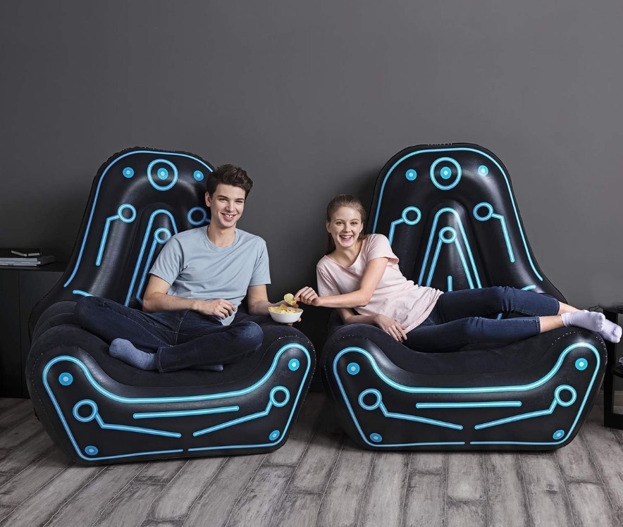 Disfruta jugando a tu videojuego favorito desde la comodidad de este sillón inflable. El brazo y los respaldos de gran tamaño son del tamaño perfecto para descansar, y la impresión futurista seguramente encajará en su sala de juegos o dormitorio. Además, hay un bolsillo de almacenamiento de malla para sus controladores adicionales. Portátil, cómodo e increíble.